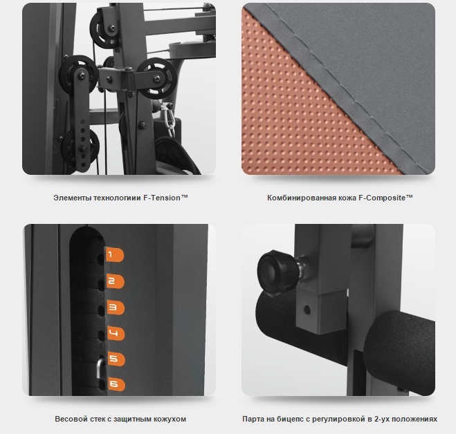 Первая, она же центральная станция позволяет выполнить массу различных упражнений – жим от груди, баттерфляй, верхняя тяга, нижняя тяга, гребная тяга, упражнения на бицепс (с использованием парты), упражнения на трицепс (с использованием верхней тяги с наращенной цепью), упражнения на пресс и спину (с использованием накладки на спину), а также отведение и приведение ног (с использованием входящего в комплект держателя для голени).