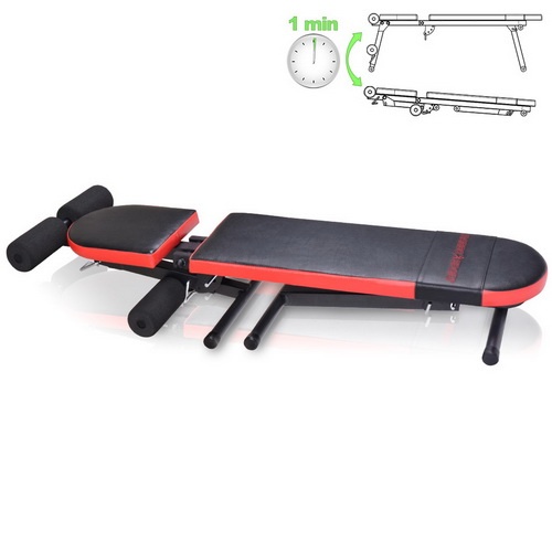 Возможность установки отрицательного и положительного углов наклона позволяет максимально сбалансировано развивать мышцы верхней части тела. Для удобства хранения скамья имеет складную конструкцию.