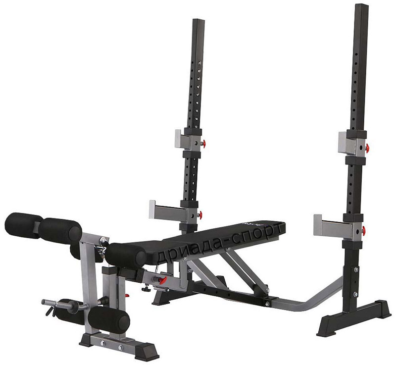 Стойки с шириной олимпийского стандарта расположены должным образом для жимов на прямой скамье, под углом вверх, вниз и для жима сидя.