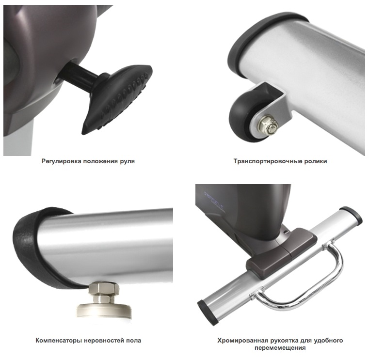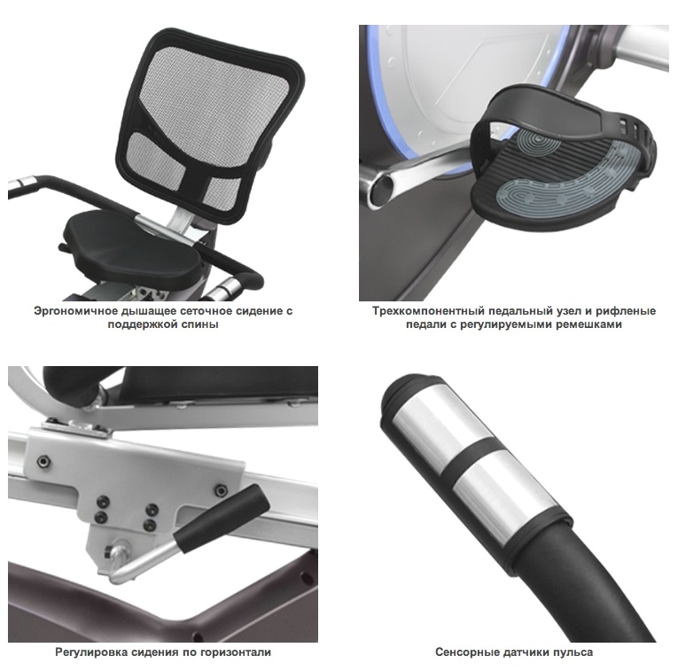 Биомеханическая часть представлена тяжелым сбалансированным маховиком весом 10 кг., трехкомпонентным педальным узлом, многожильным ремнем приводной системы и высококачественными подшипниками. За навигацию отвечает цветная многофункциональная консоль с сенсорным управлением (Touch screen) - она действительно удобна, информативна, проста в использовании и обладает хорошим временем отклика. Программный пакет многообразен и способен решить самый широкий спектр задач - от тренировки выносливости и силовой нагрузки до борьбы с лишним весом и укрепления сердечно-сосудистой системы. На тот случай, если все-таки потребуется индивидуальный тренировочный профиль, его можно легко составить и сохранить в одной из 4-ех пользовательских программ. Важной особенностью тренировочного компьютера является наличие пульсозависимых программ. Для точного определения пульса и просто комфортной тренировки в компьютер встроен беспроводной приемник. По завершении тренировки функция Recovery оценит способность сердечно-сосудистой системы к восстановлению.