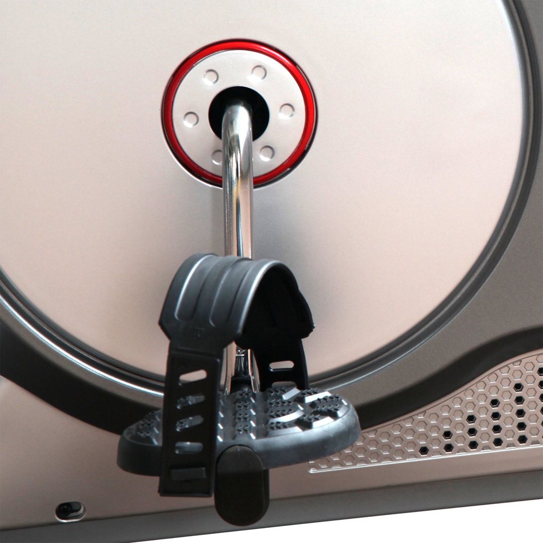 Компактный велотренажер с вертикальной посадкой и комфортным сидением.