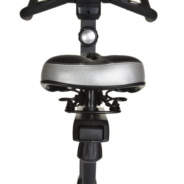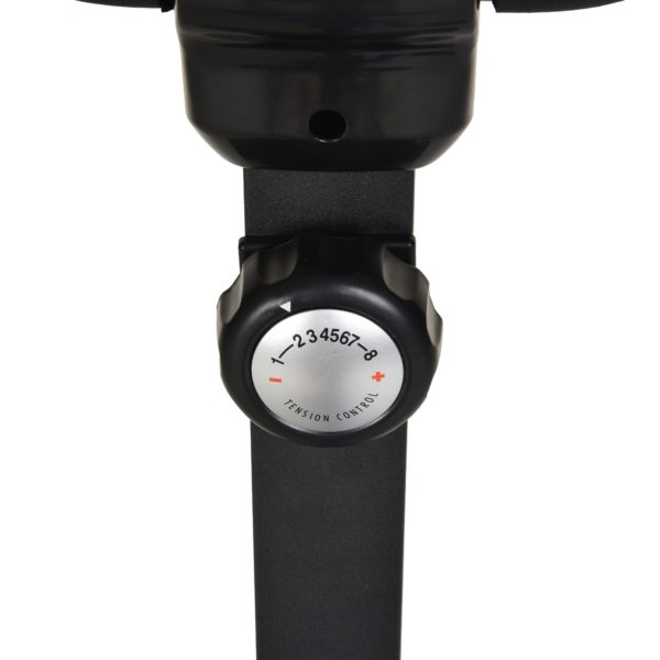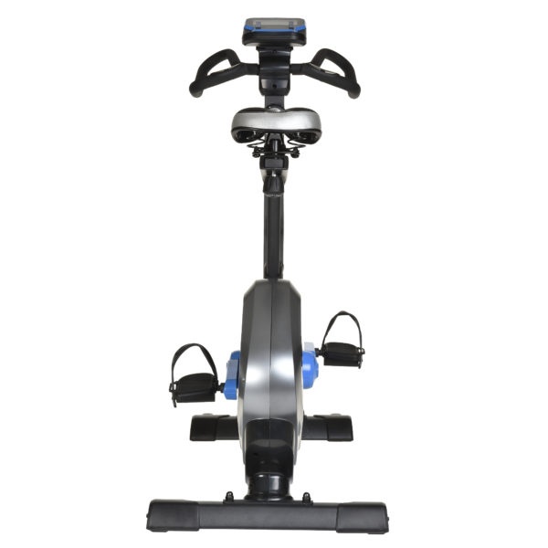 Компьютер с LCD дисплеем прост в управлении, и отображает все основные параметры тренировки – время, пройденную дистанцию, скорость, расход калорий, обороты в минуту и пульс, что позволяет эффективно контролировать весь процесс тренировки. Сенсорные датчики съема пульса вмонтированы в руль тренажера. Нагрузка регулируется механическим путем в 8 положениях.