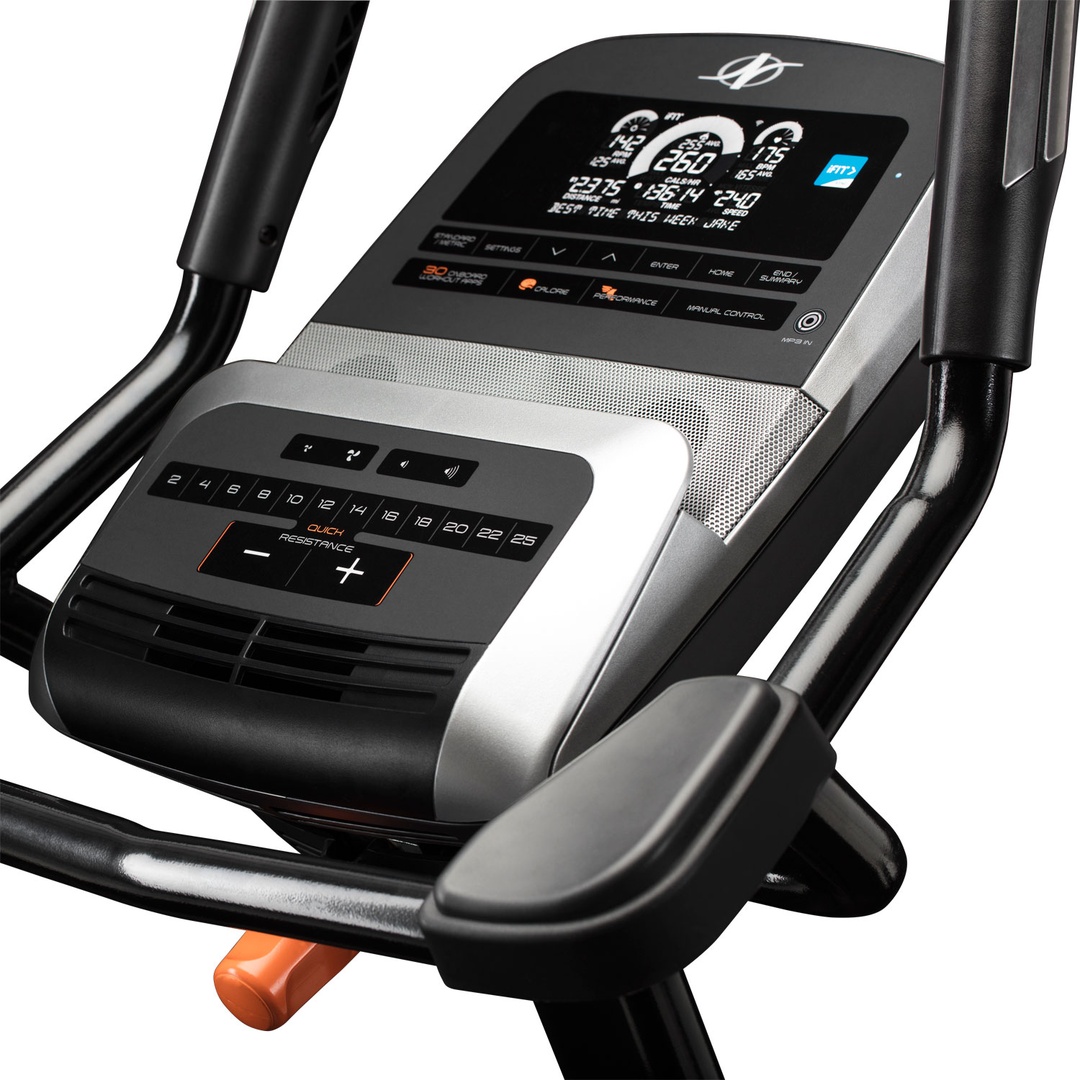 Регулировки сидения и руля позволит подобрать оптимальную посадку, а 9кг маховик и 25 уровней бесшумного электромагнитного сопротивления – оптимальную нагрузку. Консоль с 5"дисплеем, с управлением нагрузкой одним касанием OneTouch®, 30 установленными программами тренировок, звуковой системой и регулируемым вентилятором AutoBreeze™ отвечает всем современным требованиям. Держатель для бутылки и полочка для девайсов также не покажутся вам лишними.