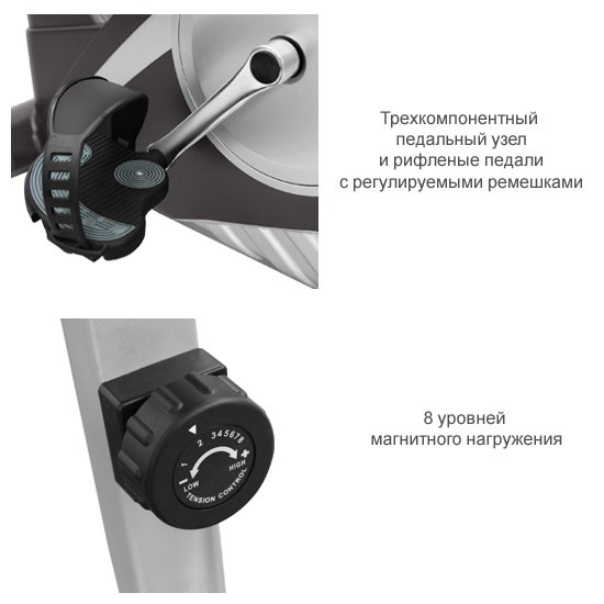 Биомеханика представлена тяжелым сбалансированным маховиком весом 9 кг., трехкомпонентным педальным узлом, многожильным ремнем приводной системы и высококачественными подшипниками.