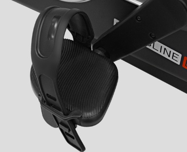Педали обладают специальными прорезиненными ремешками, которые позволяют заниматься в открытой обуви и не пережимают лодыжку. Регулировка ремешков позволяет подогнать натяжение под любом размер ноги. Рифленая поверхность педалей обеспечивает уверенное сцепление с подошвой обуви при любых скоростях педалирования.