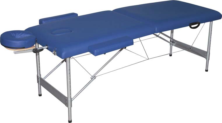 Раскладной массажный стол от торговой марки HouseFit покрыт экологически-чистым кожзаменителем светло-голубого или белого цвета, компактен (22 кг), в сложенном состоянии напоминает чемодан, что значительно облегчает его транспортировку.