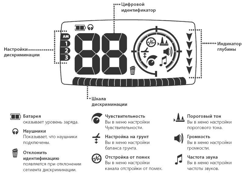 Меню и клавиши управления металлоискателя X-Terra 505 выполнено в виде пиктограмм. Они легко запоминаются и будут понятны даже новичку, впервые взявшему металлодетектор в руки. Инструкция полностью на русском языке.