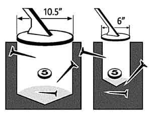 На рисунке видно, с какой проблемой сталкивается поисковик, работая большой катушкой на участке, где цели располагаются близко друг к другу. Сигнал от монеты перекрывается сигналом от гвоздей. В этом случае цель может быть пропущена, так как дискриминатор металлоискателя не в состоянии различить одновременно две цели: вы слышите непонятный и неустойчивый сигнал, а если железная цель превышает по размеру монету, дискриминатор однозначно укажет на железо, и цель будет пропущена. В таких условиях, очевидно, чем меньше диаметр катушки, тем проще ориентироваться. Для подводного поиска применяют катушки Concentric, они полностью защищены от воды. Катушки DoubleD (DD) погружать в воду нельзя.