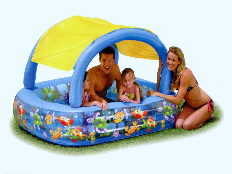 В нем могут купаться несколько детей одновременно. Бассейн квадратный, со съемным солнцезащитным козырьком и широкими бортами. В набор входит ремкомплект. Навес на липучках - легко снимается.