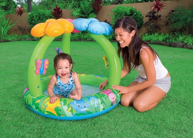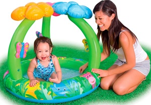 Навес в виде красочных надувных цветов расположенный на надувной дуге защищает малыша от прямых солнечных лучей ,а надувные игрушки в виде бабочек , входящих в комплект, не позволяют малышу скучать.
