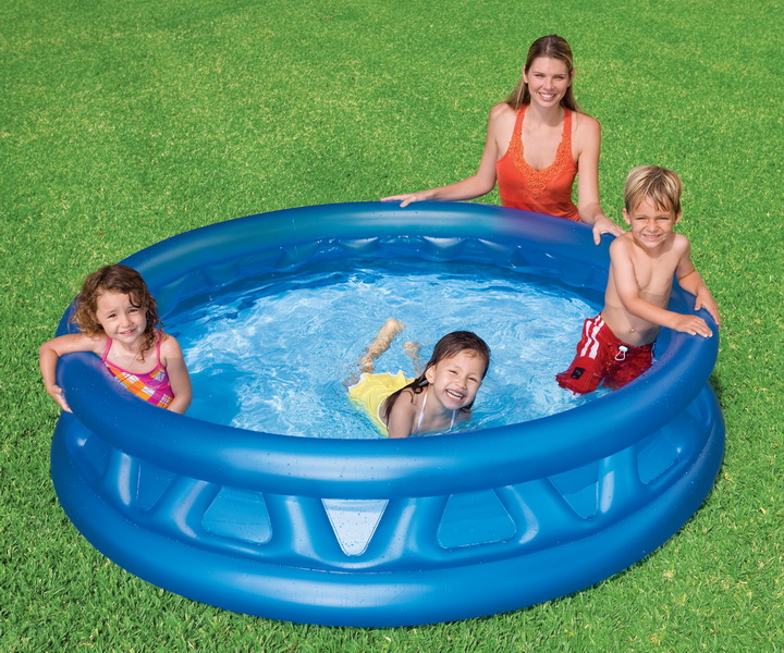 Детский надувной бассейн непрозрачными внешними стенками и водоотводом в полу. Бассейн сделан из прочного винила, имеет надувное дно. В нем могут купаться несколько детей одновременно.