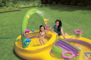 Подключив к ней садовый шланг Вы получаете фонтанчик дарующий свежесть и прохладу. Также в игровом центре предусмотрены специальные надувные палочки для набрасывания 4-х надувных колец, а по бокам расположено два прекрасных цветка-кольца для метания 6-ти разноцветных пластиковых мячиков.