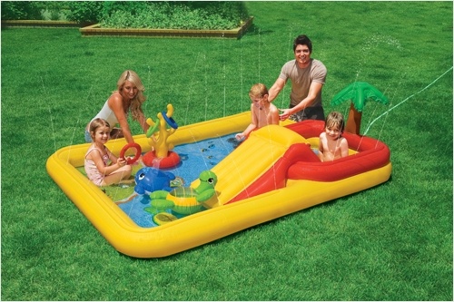 Центр представляет собой надувную конструкцию - мягкую и безопасную. Если к игровому центру подключить обычный садовый шланг, то получится бассейн с фонтанчиками.