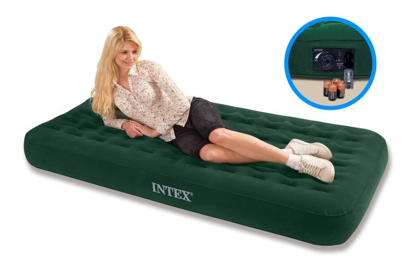Односпальный надувной матрас размером 191 x 99 x 23 см зеленого цвета. В корпус матраса встроен электронасос, работающий от батареек. Верхняя часть надувного матраса имеет флокированное покрытие.