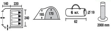 | Все размеры: | внешняя палатка 360х240 см, внутренняя палатка 240х220 см, тамбур 140х240 см |