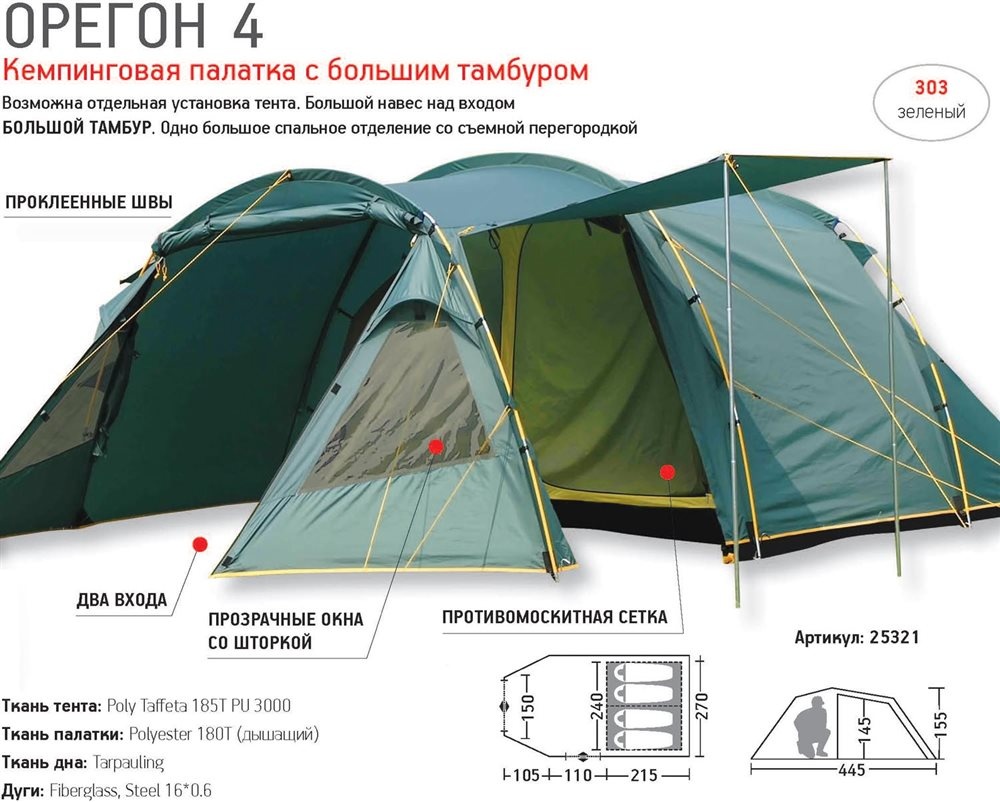 Одна из ведущих позиций интернет магазина палаток. Имеет большой тамбур и одно большое спальное отделение со съемной перегородкой. Прозрачные окна со шторкой. Над входом большой навес. Возможна отдельная установка тента.