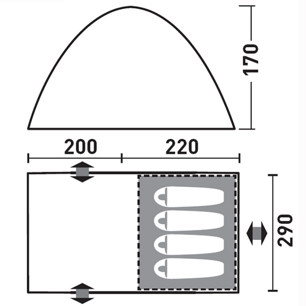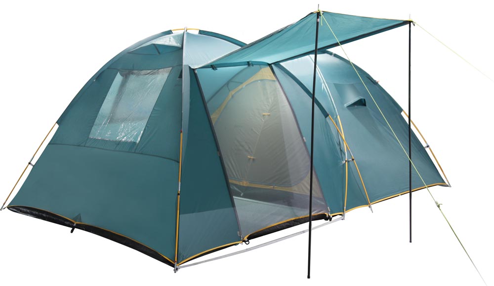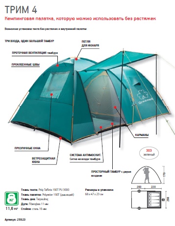 Два входа, один большой тамбур. Проточная вентиляция тамбура. Возможна установка тента без растяжек и внутренней палатки.