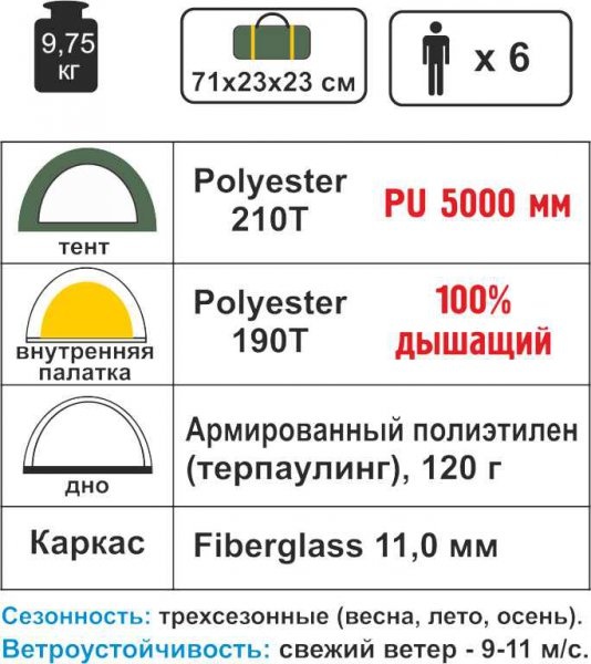 Палатка TORNADO 6 - это кемпинговая дуговая палатка с вместительным тамбуром и большим спальным отделением на 6 человек.