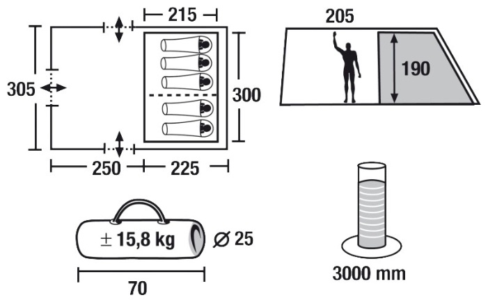 | Водостойкость тента/дна | 3000 / 3000 мм в.ст. |