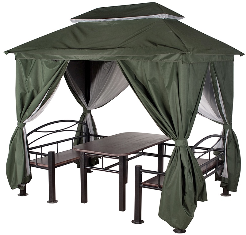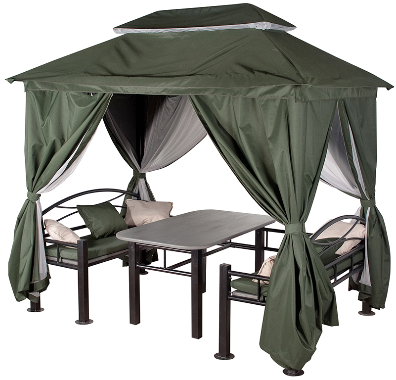 | Комплектация | шатёр с тентом со съемной антимоскитной сеткой и 4-мя стенками на молниях, стол, 2 встроенные скамейки, 2 текстильных матраса-сидения, 6 подушек |