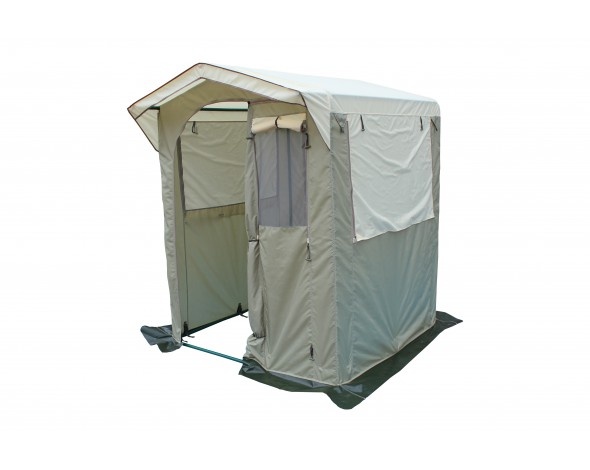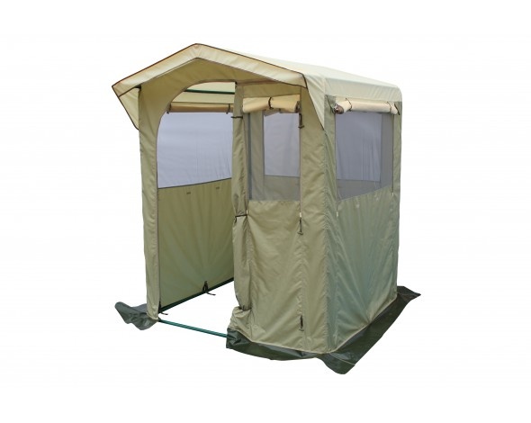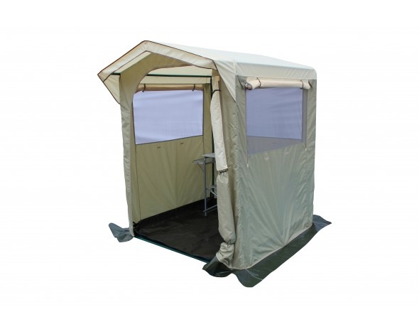 Каждая кухня оснащена окнами или стенками с противомоскитными сетками, которые закрываются шторками, одна из стенок используется как вход, регулируемый по ширине или по высоте (зависит от типа кухни)*. Тенты для таких кухонь сшиты из непромокаемой прочной ткани. На задней стенке есть регулируемое отверстие для провода (электрического или газового). Кухню легко собирать и разбирать, все детали каркаса надежно крепятся между собой, делая конструкцию устойчивой. Палатка-кухня надежно защитит от неблагоприятных погодных условий.