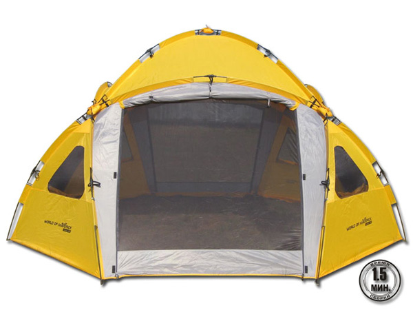 Конфигурация пола шатра представляет собой восьмиугольник. Шатер имеет четыре больших входа-двери. Каждая из них закрывается противомоскитной сеткой и сверху сетки дублируется дождезащитной стенкой. И сетки и стенки фиксируются по бокам застежками-«молниями».
