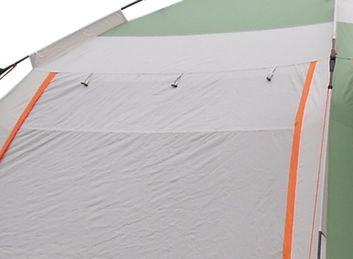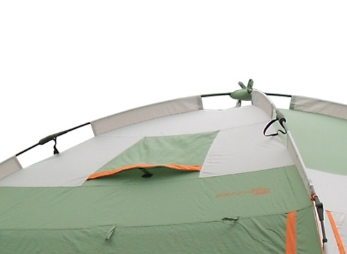 Шатер имеет два входа с противоположных сторон и два окна во всю стену, которые снабжены противомоскитными сетками и дублируются ветрозащитными стенками на молнии.