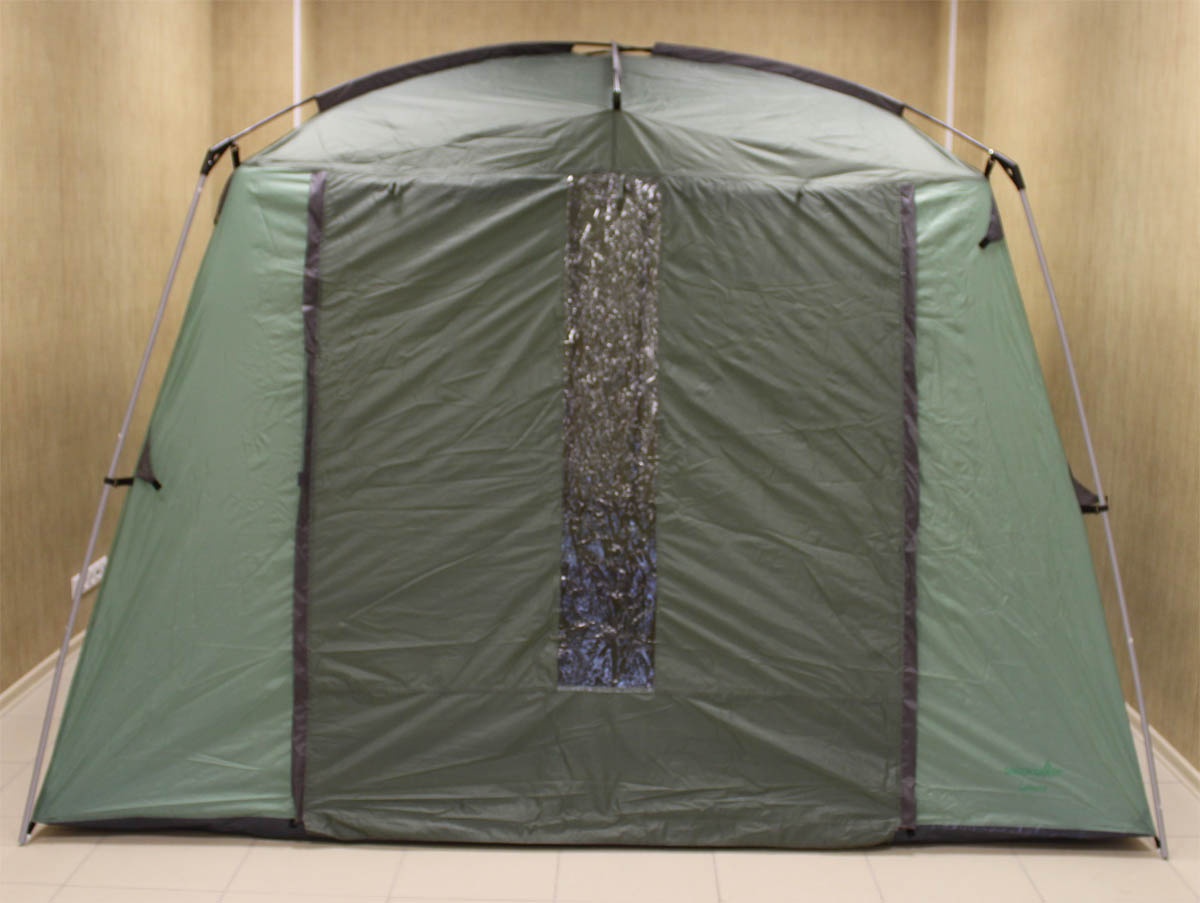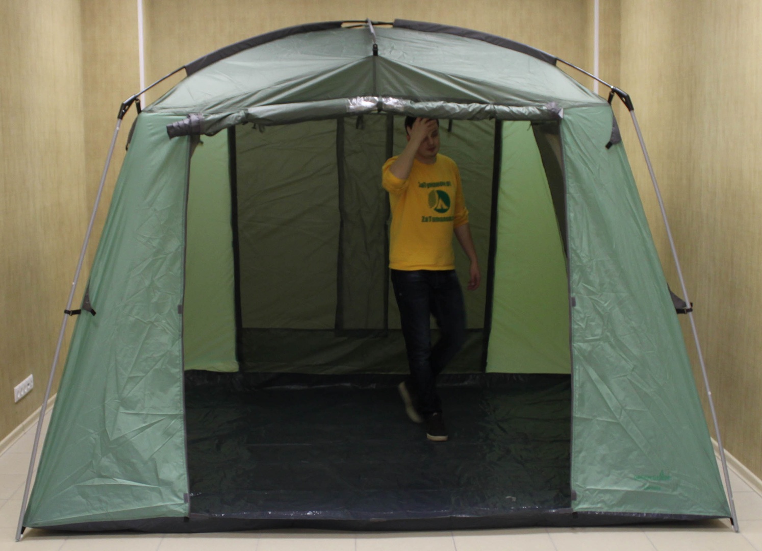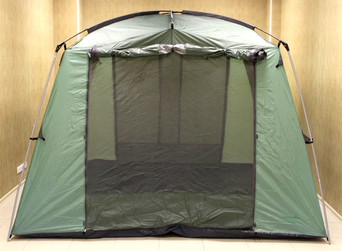 В этом шатре два входа, т.е. с двух сторон Вы можете расстегнуть двойную молнию, поднять и закатать вверх и москитную и глухую стенку, если Вам это необходимо. С двух других сторон москитная сетка вшита и не поднимается, а вот глухие стенки Вы можете поднять, расстегнув молнию, и, закатав стенку вверх.