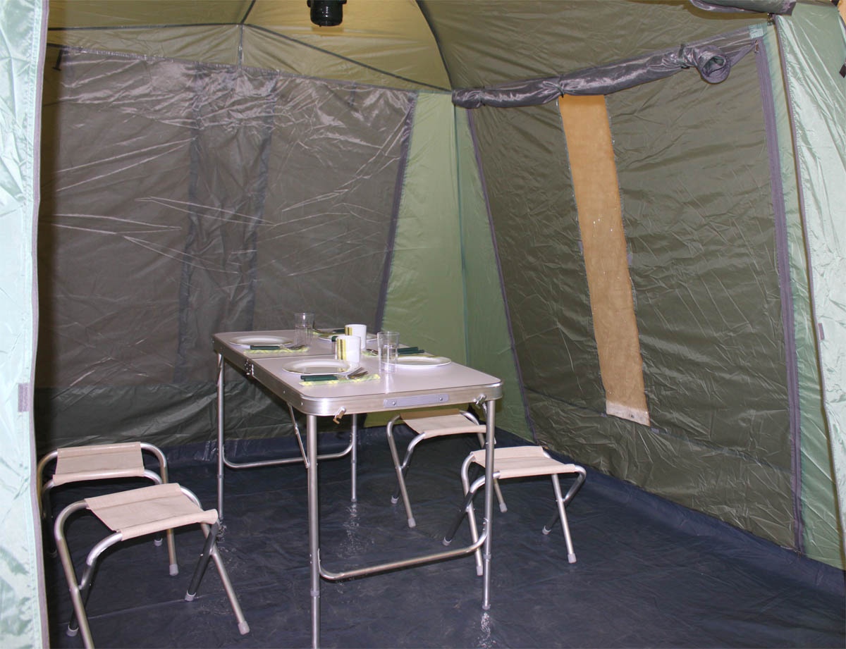 Этот кемпинговый шатер имеет вшитый пол из армированного полиэтилена (полностью не промокаемого), а значит в Вашей столовой или комнате отдыха всегда будет чище, чем на земле:) Не забывайте хорошо растянуть тент, чтобы внешняя стенка не свешивалась внутрь шатра и по ней на пол при дожде не попадала вода.