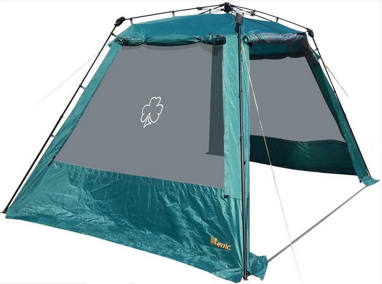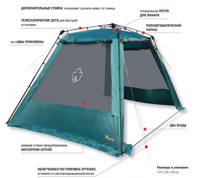 Тент-беседка увеличенного размера с полуавтоматическим каркасом, телескопическими дугами для быстрой установки и двумя входами. Каждая стенка оснащена москитной сеткой и опускающейся глухой стенкой. Дополнительные стойки, позволяют сделать выносной навес от солнца. Все швы проклеены. Специальная петля для фонаря. Облегченная регулировка оттяжек. Оттяжки со световозвращающей нитью.
