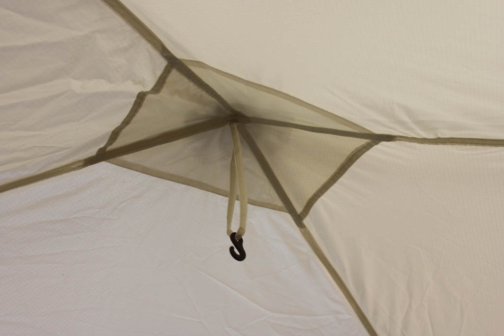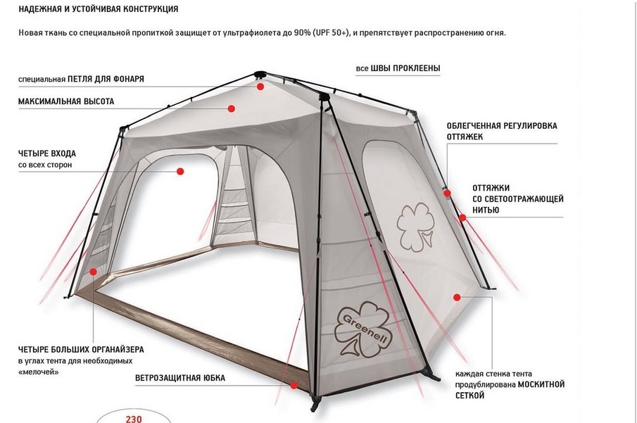 Новая ткань со специальной пропиткой защищает от ультрафиолета до 90% (UPF 50+), и препятствует распространению огня. Все швы проклеены. Специальная петля для фонаря. Облегченная регулировка оттяжек. Оттяжки со светоотражающей нитью.