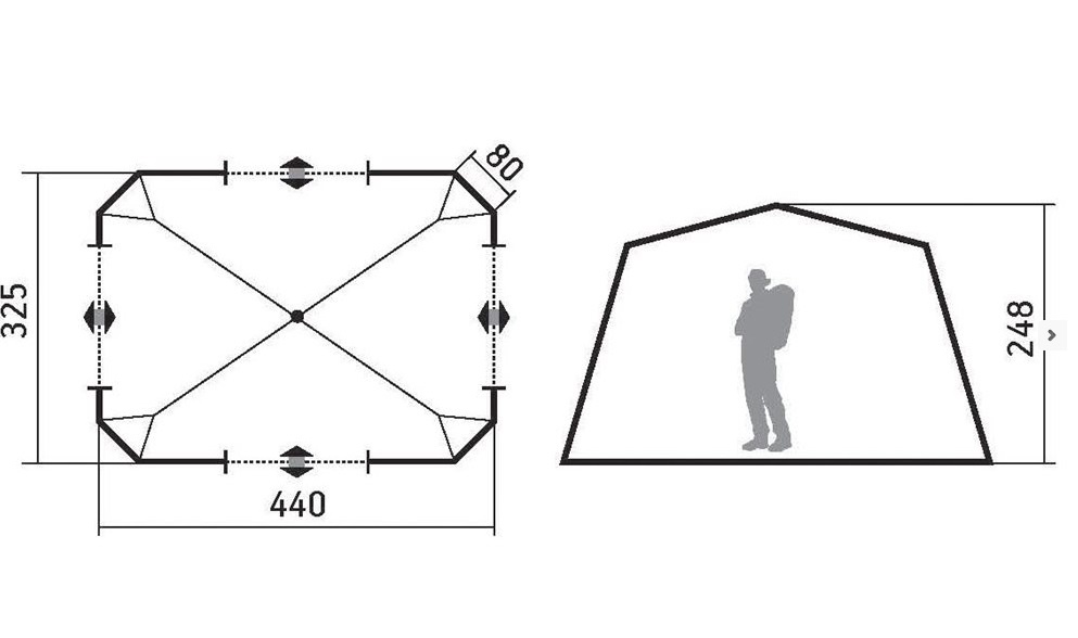 В этом шатре площадью 14,3 кв. м. комфортно разместится 16 человек.