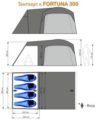 Пристройка к шатру-тенту Fortuna 300 в качестве спального отделения. Добавив к шатру-тенту спальное отделение, получается комфортная и просторная кемпинговая палатка для 4 человек. Тентхаус и шатер-тент Fortuna 300 имеют множество больших окон и вентиляционных отверстий, как в боковых стенках, так и в крыше тента, что позволяет тонко настроить комфортный микроклимат внутри палатки независимо от внешних погодных условий.