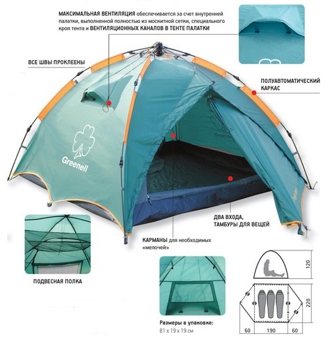 Вместительность составляет три человека. Имеет удобный полуавтоматический каркас.