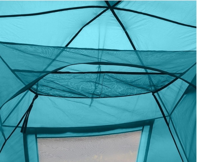 Максимальная вентиляция обеспечивается за счет внутренней палатки, выполненной полностью из москитной сетки, специального кроя тента и вентиляционных каналов в тенте палатки.
