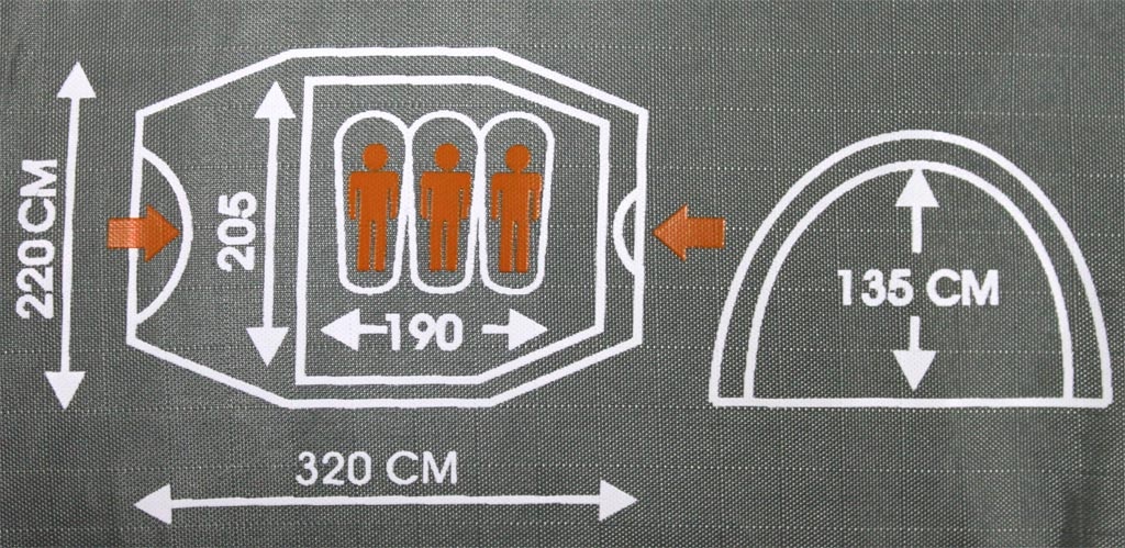 | Внешняя палатка (ДхШхВ) | 220x320x135 см |