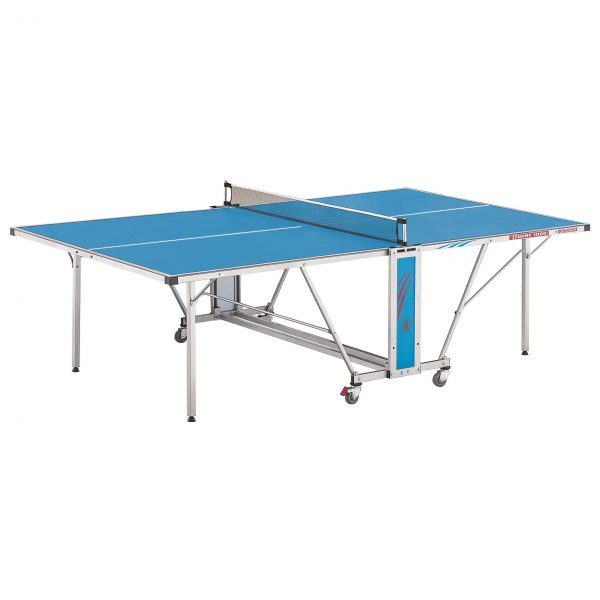 Столешница выполнена из 6 мм алюминиевого композита ACP с антибликовым покрытием, защитой от ультрафиолетового излучения и атмосферных осадков. Алюминиевый композит ACP более плотный материал чем Меламин, что способствует лучшему отскоку мяча чем от меламиновой столешницы такой же толщины. Стол оснащен металлическим кантом 30х20 мм, который придает столешнице максимальную жесткость, еще больше улучшая отскок мяча.