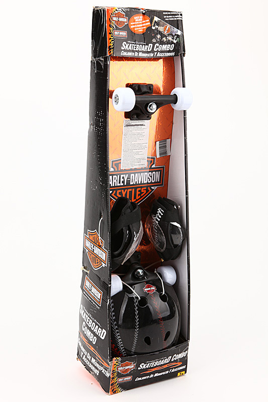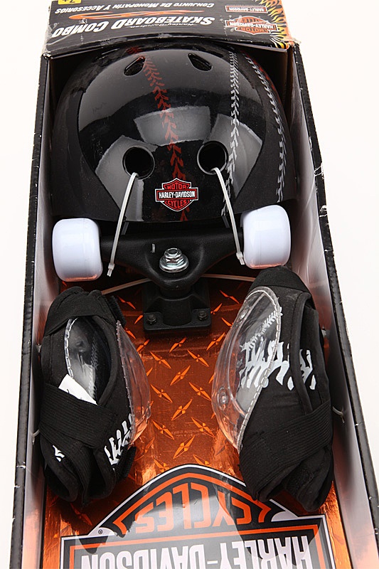 Набор HARLEY DAVIDSON включает в себя скейтборд, литой шлем, наколенники, налокотники.