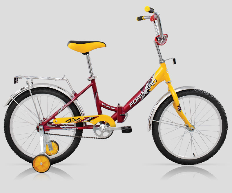 Детский городской велосипед на складной укороченной раме. Велосипед укомплектован удобным высоким рулем, задним ножным тормозом, багажником, защитой цепи и специальным детским седлом. В комплекте прилагаются поддерживающие колесики.