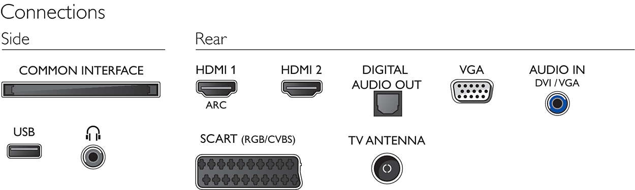 | Другие подключения | общий интерфейс CI+, цифровой выход аудиосигнала (оптический), выход для наушников, разъем для сервисного обслуживания, антенна, IEC75, аудиовход (DVI) |