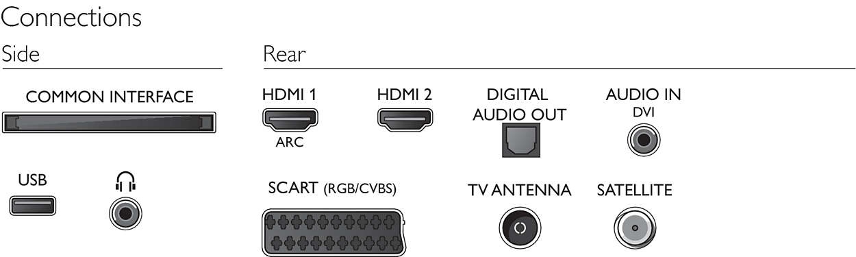 | Другие подключения | общий интерфейс CI+, цифровой выход аудиосигнала (оптический), разъем для спутниковой приставки, антенна, IEC75, аудиовход (DVI), выход для наушников |