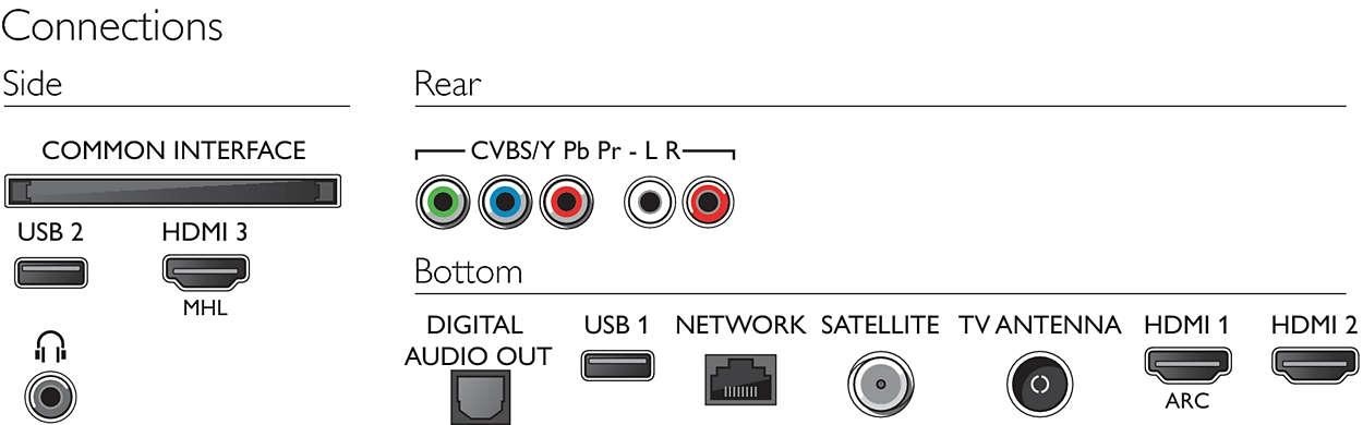 | Другие подключения | Ethernet-LAN RJ-45, Антенна, IEC75, Аудиовход — левый/правый, Выход для наушников, Общий интерфейс CI+, Цифровой выход аудиосигнала (оптический) |