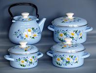 Цвет эмали - голубой. Нанесен рисунок. Форма цилиндр.В наборе: кастрюли 1,5; 2,3; 3,0л, чайник 3,0л с подвижной ручкой.