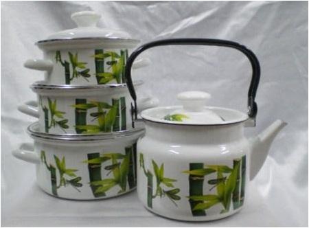 Цвет эмали - белый. Нанесен рисунок. Форма цилиндр. В наборе: кастрюли 2,0; 3,0; 4,0л (крышка металлическая с пластиковой ручкой, на корпусе ручки металлические полые 2шт), чайник 2,0л (с подвижной металлической ручкой, крышка металлическая с пластиковой ручкой).