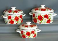 Цвет эмали - белый. Нанесен рисунок на корпусе и на крышке. Форма цилиндр. В наборе: кастрюли 2,3; 3,0; 4,0л (крышка металлическая с пластиковой ручкой, на корпусе ручки металлические полые 2шт).