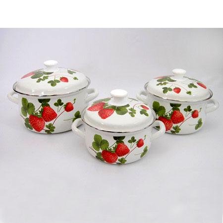 Цвет эмали - белый. Нанесен рисунок на корпусе и на крышке. Форма грушевидная. В наборе: кастрюли 2,0; 3,0; 4,0л (крышка металлическая с пластиковой ручкой, на корпусе ручки металлические полые 2шт).