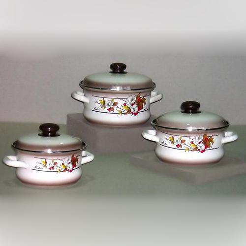 В наборе: кастрюли 1,6л, 2,1л, 3л. Форма с элементом "тор".Эмаль кремовая, напыление на корпусе и крышке