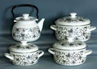 Цвет эмали - белый. Нанесен рисунок на корпусе и на крышке. Форма сферическая. В наборе: кастрюли 2,0; 3,0; 4,0л (крышка металлическая с пластиковой ручкой, на корпусе ручки металлические полые 2шт), чайник 3,0л (с подвижной металлической ручкой, крышка металлическая с пластиковой ручкой).
