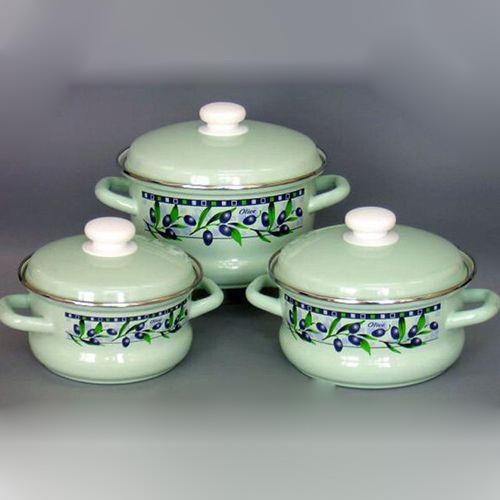 Цвет эмали - салатовый. Нанесен рисунок. Форма с элементом тор. В наборе: кастрюли 1,6; 2,1; 3,0л (крышка металлическая с пластиковой ручкой, на корпусе ручки металлические полые 2шт).