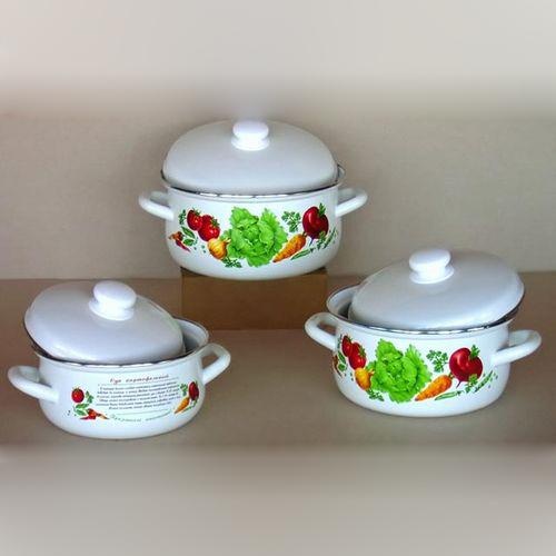 Цвет эмали - белый. Нанесен рисунок. Форма сферическая. В наборе: кастрюли 2,0; 3,0; 4,0л (крышка металлическая с пластиковой ручкой, на корпусе ручки металлические полые 2шт).
